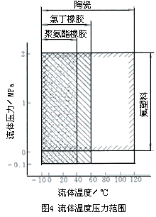 (1) 襯里材料(或直接與介質(zhì)接觸的測量管) 常用襯里材料有氟塑料、聚氨酯橡膠、氯丁橡膠和陶瓷等。近年有采用高純氧化鋁999.7%AI2O3)陶瓷制成襯里的,但只限中小口徑傳感器。 氯丁橡膠和玻璃鋼用于非腐蝕性或弱腐蝕性液體,如工業(yè)用水、廢污水及弱酸堿,價格*為低廉。氟塑料具有優(yōu)良的耐化學腐蝕性,但耐磨性差,不能用于測量礦漿液。氟塑料中*早應(yīng)用的是聚四氟乙烯,因與測量管間僅靠壓貼,無粘結(jié)力,不能用于負壓管道,后開發(fā)各種改性品種,實現(xiàn)注塑成形,與測量管有較強結(jié)合力,可用于負壓, 聚氨酯橡膠有極好的耐磨耗性,但耐酸堿的腐蝕性較差。它的耐磨性相當于天然橡膠的10倍,適用于煤漿、礦漿等;介質(zhì)溫度要低于40~60/70℃。氧化鋁陶瓷有極好的耐磨耗性和對強酸堿的耐磨腐蝕性,耐磨性約為聚氨酯橡膠的10倍,適用于具有腐蝕性的礦漿;但性脆,安裝夾緊時疏忽易碎,可用于較高溫度(120~140/180℃)但要防止溫度劇變,如通蒸汽**,一般溫度突變不能大于100℃,升溫150℃ 要有10min時間。 通用型EMF幾種材料的壓力溫度大體適用范圍可參閱圖4。 | ![]() |